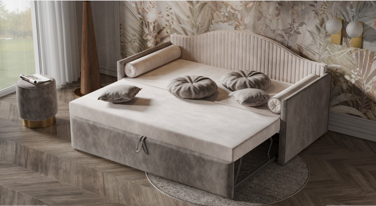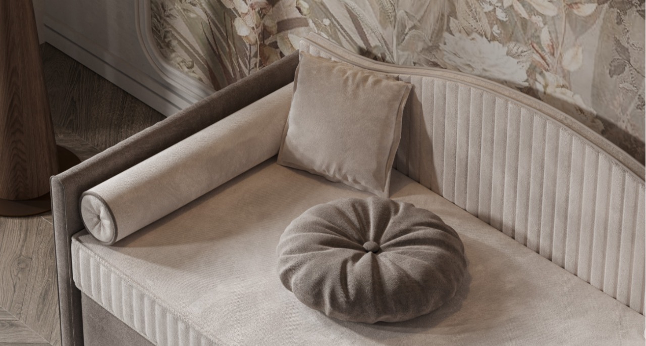 В комплектацию входят: подушки круглые, подушки квадратные, валики. Механизм основания доступен в двух вариантах. Также на выбор предлагается четыре категории ткани.