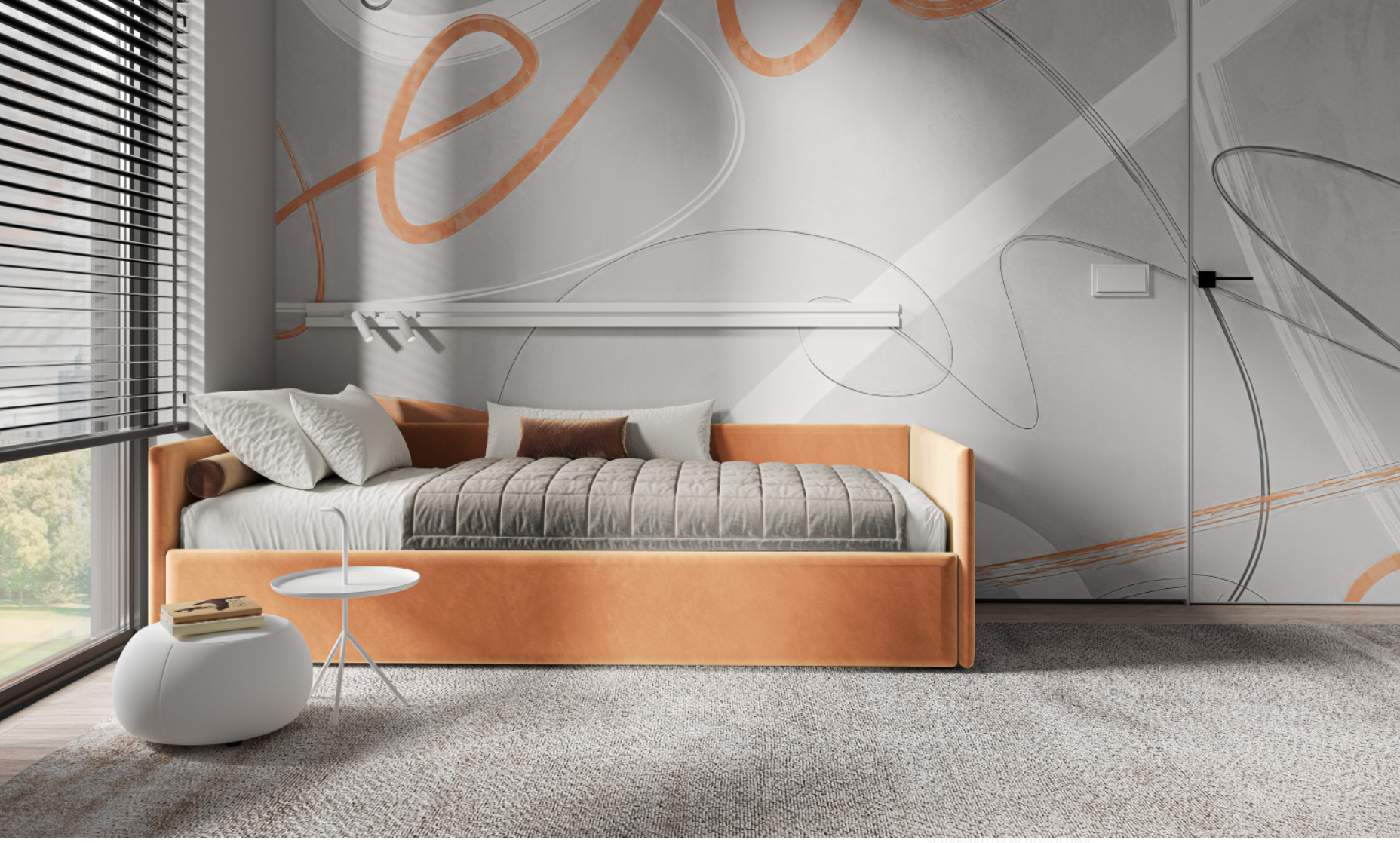 Модель детского дивана Junior лаконична, в дизайне нет излишеств, однако изюминкой является декор в виде шести подушек, идущих в комплекте: два валика, две подспинные, две небольшие квадратные. Вы можете подобрать цвет обивки дивана из большого разнообразия тканей четырех категорий, а также выбрать цвет подушек, тем самым создав свой уникальный дизайн дивана, который впишется именно в вашу детскую комнату. На этом особенности изделия не заканчиваются. Мы предлагаем вам выбрать из двух исполнений: односпальный диван с выдвижным ламинированным коробом для вещей или увеличенное спальное место для двоих, в котором используется раздвижной металлокаркас. Подлокотники детского дивана Junior узкие, имеют прямые углы. Благодаря сокращению ширины подлокотников удалось расширить спальное место. Обивочная ткань на подлокотниках соединяется в виде шва, проходящего ровно по центру. Спинка сконструирован вровень с подлокотниками. Таким образом создается очень уютное ощущение.
