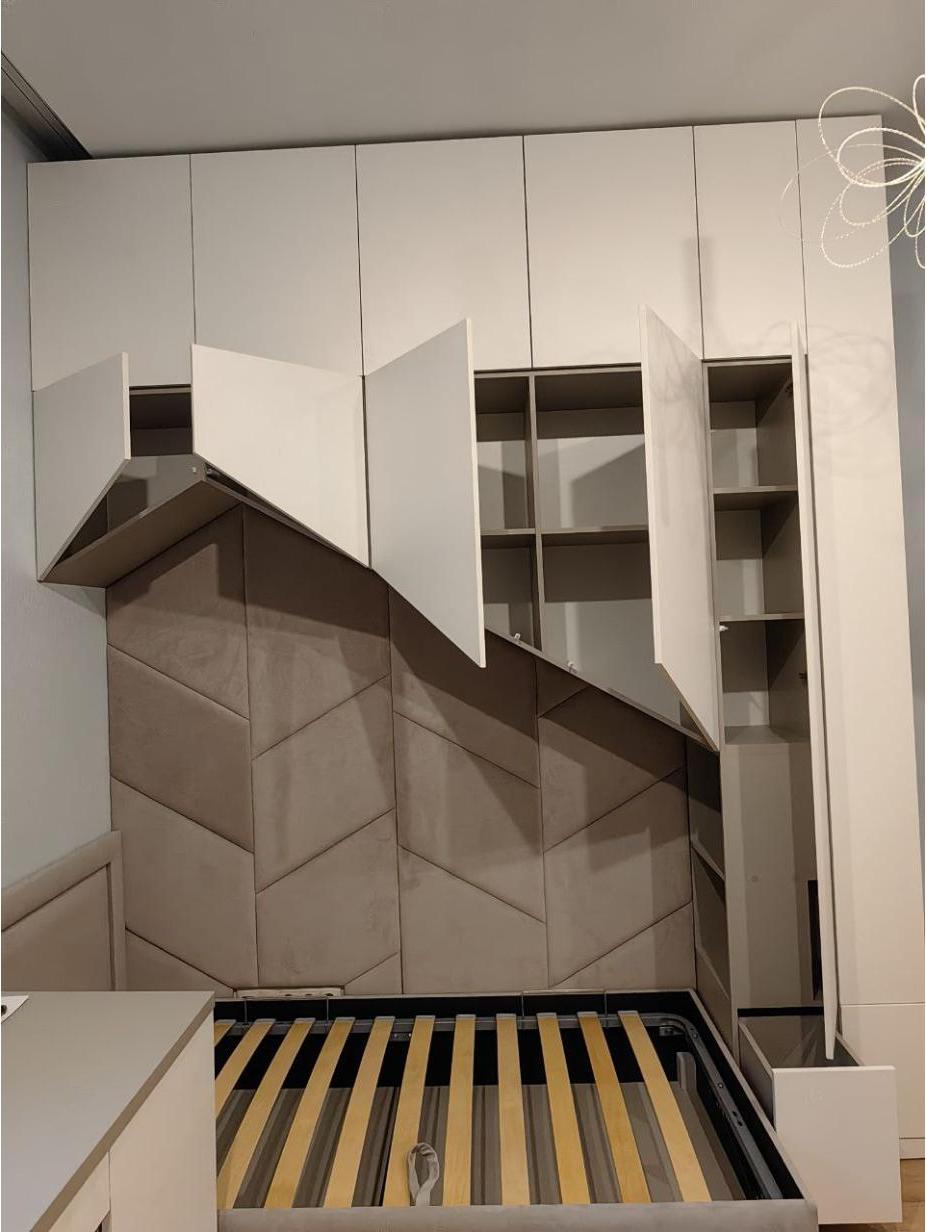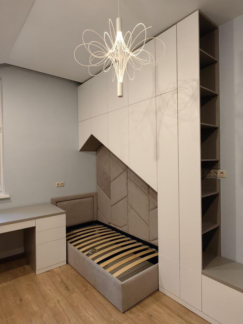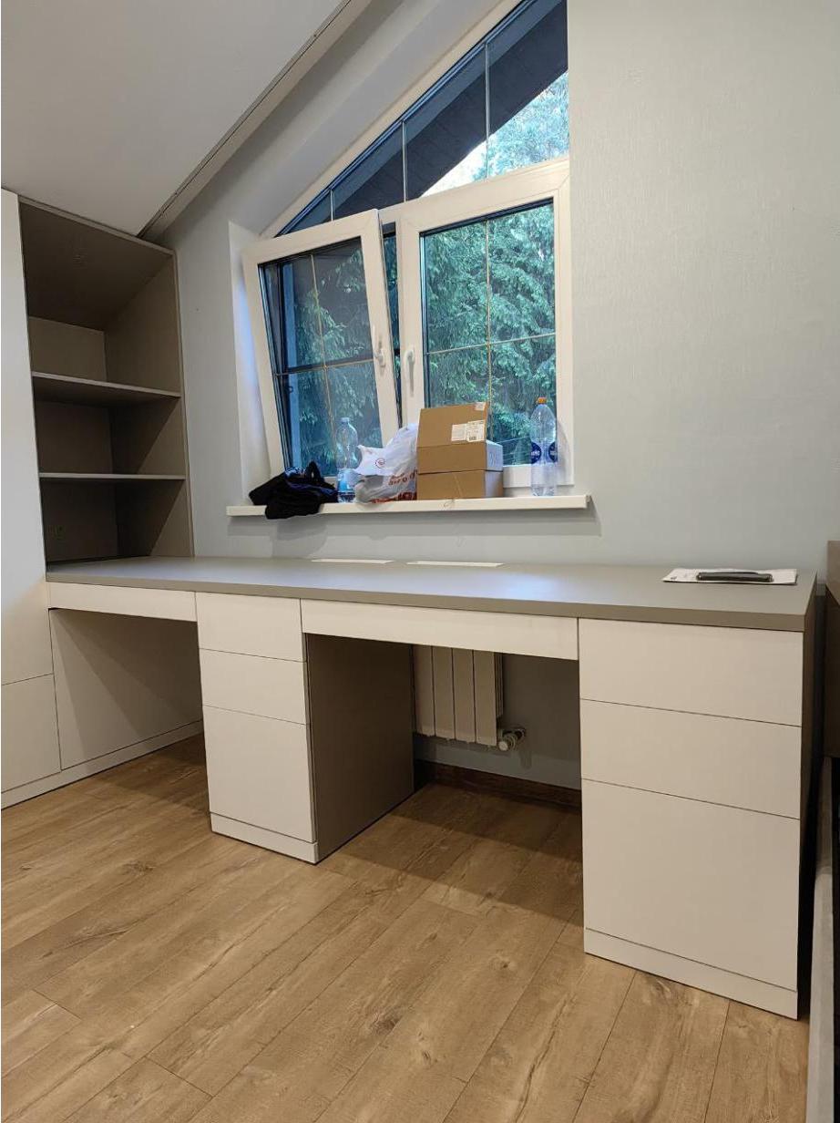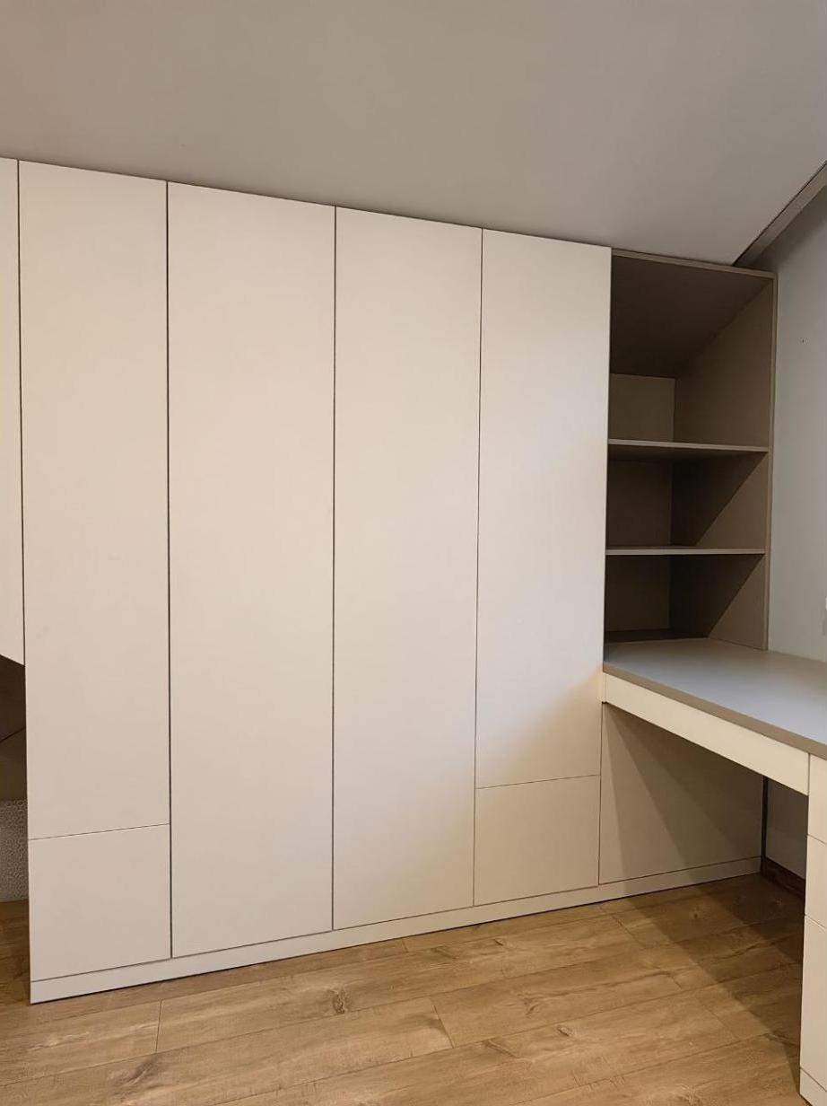 Индивидуальный проект с фрезеровкой фасадов, антресоли шкафа и настольного стеллажа.